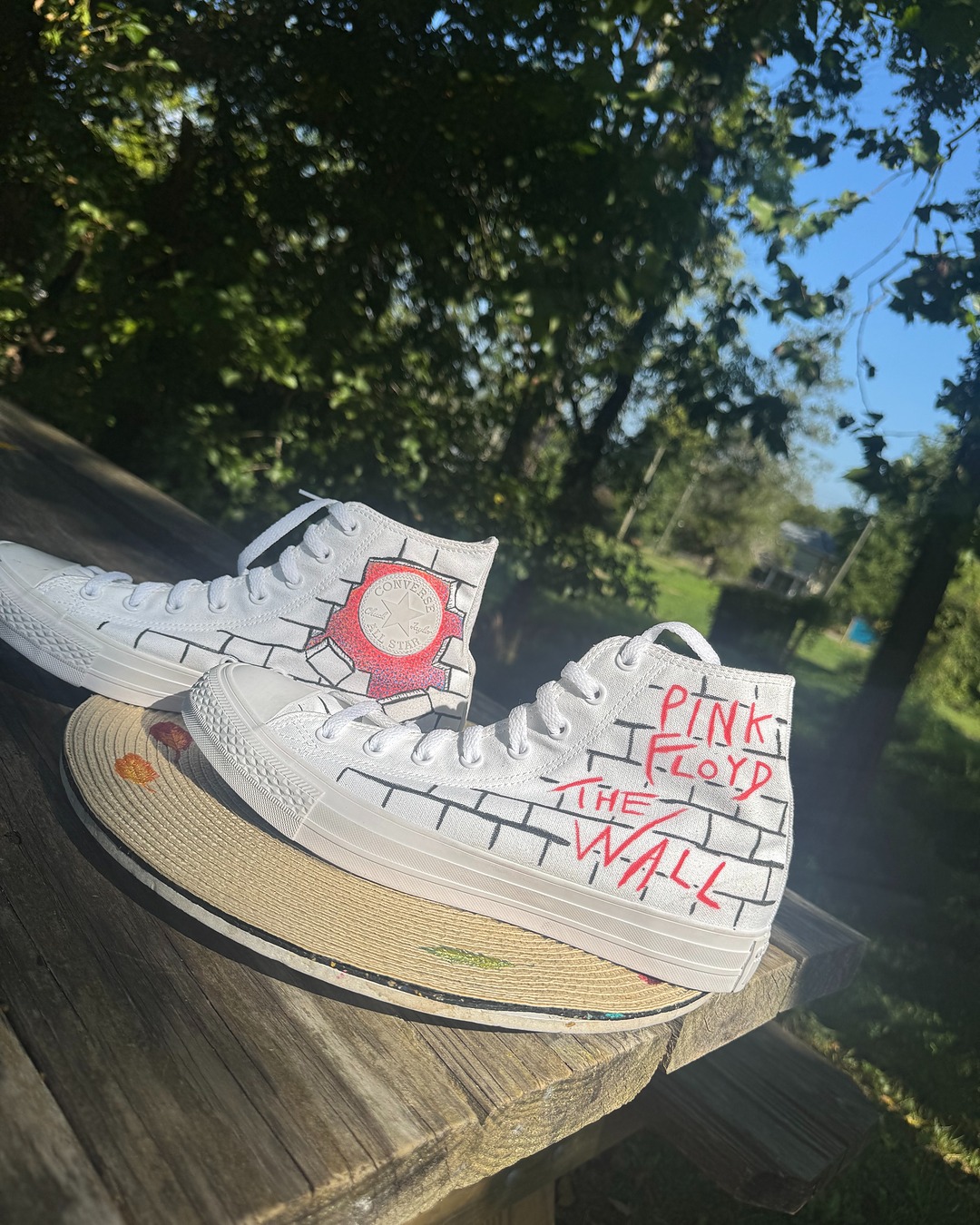 Some size 11 converse all-stars that were drawn along with this wild trip of an album. I listened to this album a few times in a row to bring these kicks to be, making this a wonky creative process. This album just has a profound effect on my psyche, placing me into the story of Pink as he traverses the wall. Sometimes, I'll end up as Pink while I'm listening and it becomes a mission to tear the wall down. Either way, these are dope shoes for wearing or to display as memorabilia.